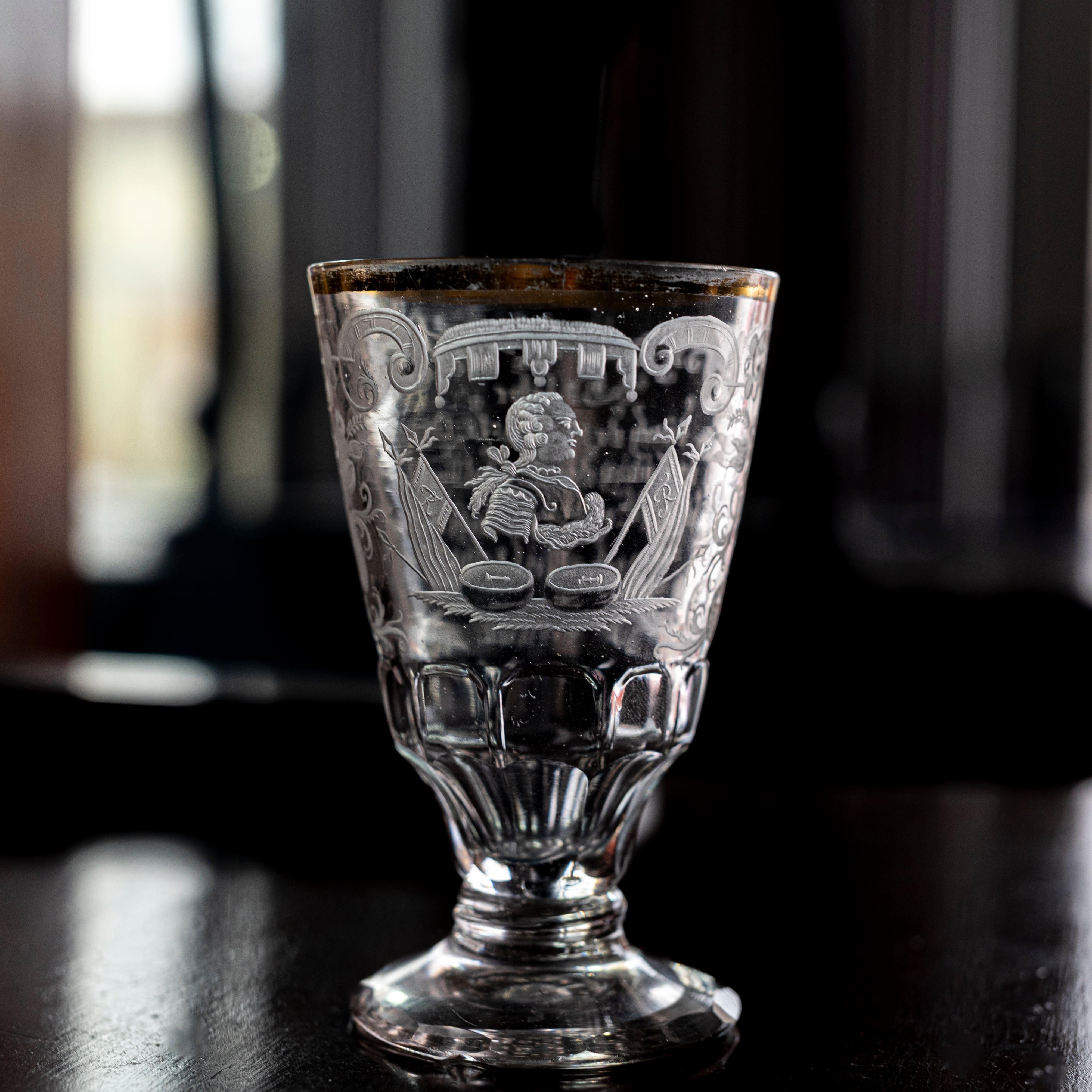 オーストリアのガラスブランド、ロブマイヤーのグラス。 1910年にシュテファン・ラートによってデザインされた、ドリンキングセットNo.206「Maria Theresia」(マリア・テレジア)のグラスです。その名の通り18世紀半ばのマリア・テレジアの時代に流行したシレジアやボヘミアのガラスを再現したモデルです。複雑で美しいキレのあるカット装飾に、繊細なバロック様式のエングレーヴィング技術を施したグラスです。カットとエングレーヴィング装飾の相乗効果で非常に美しく見えるのが特徴です。 リキュールサイズ。 在庫3客あり(値段は1客の値段)。