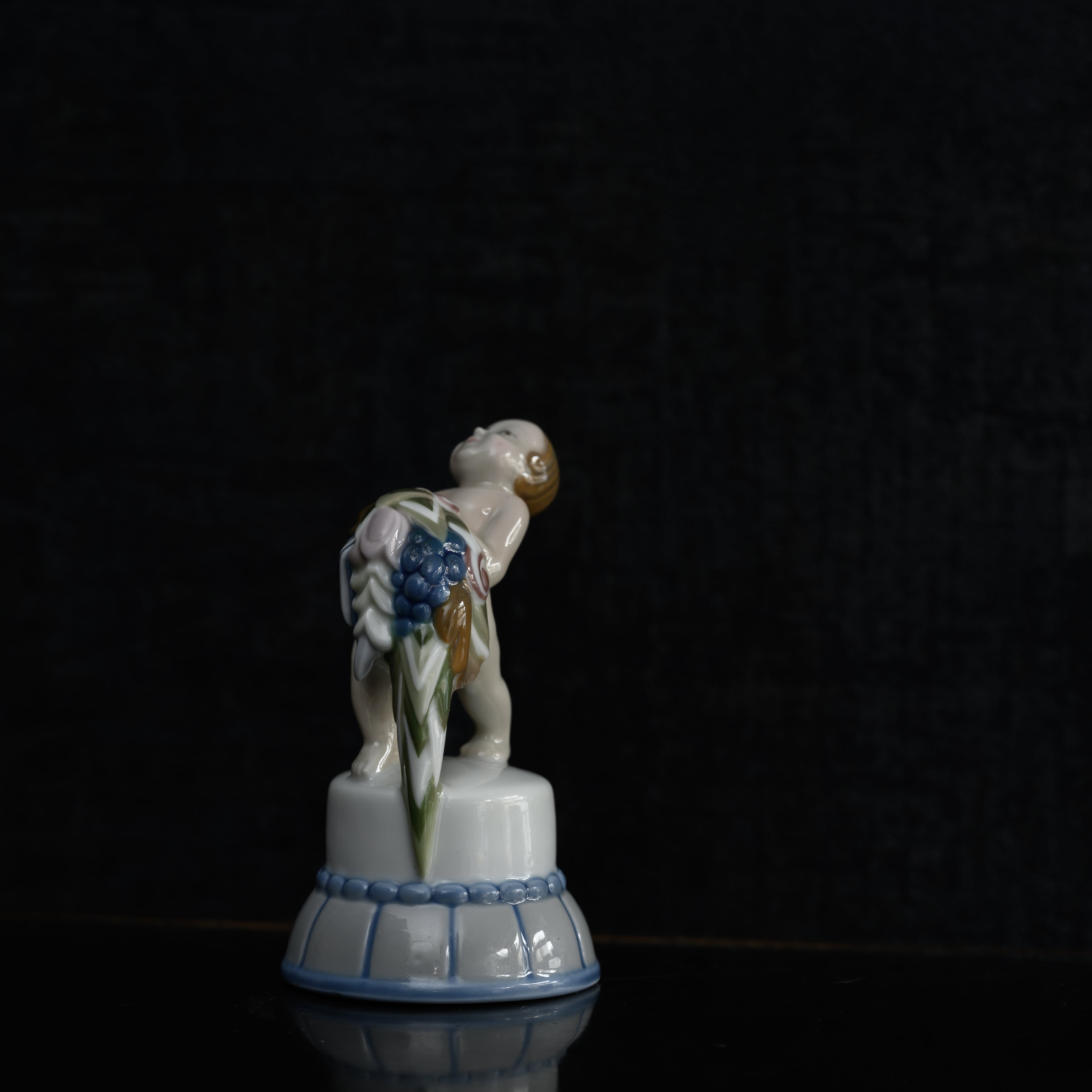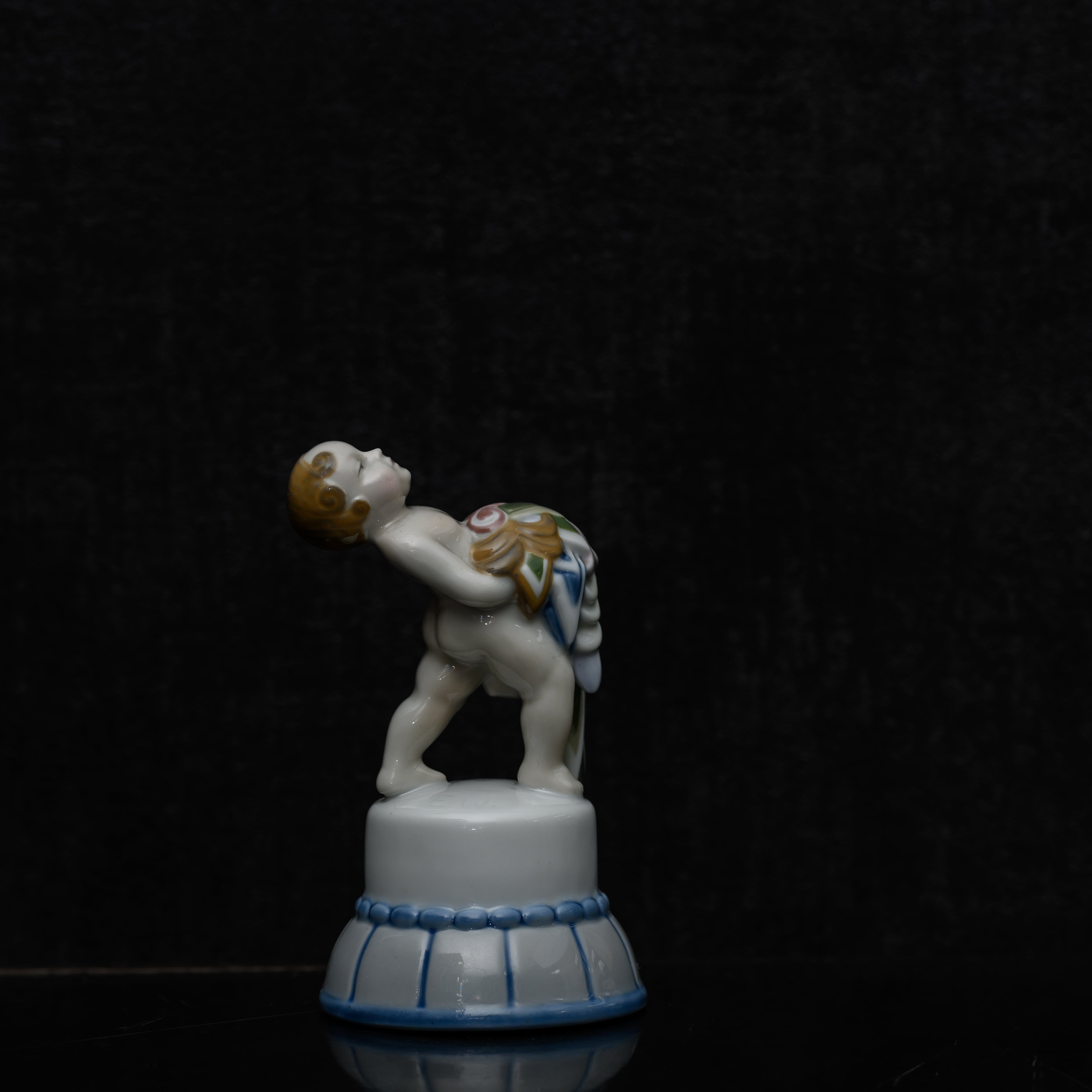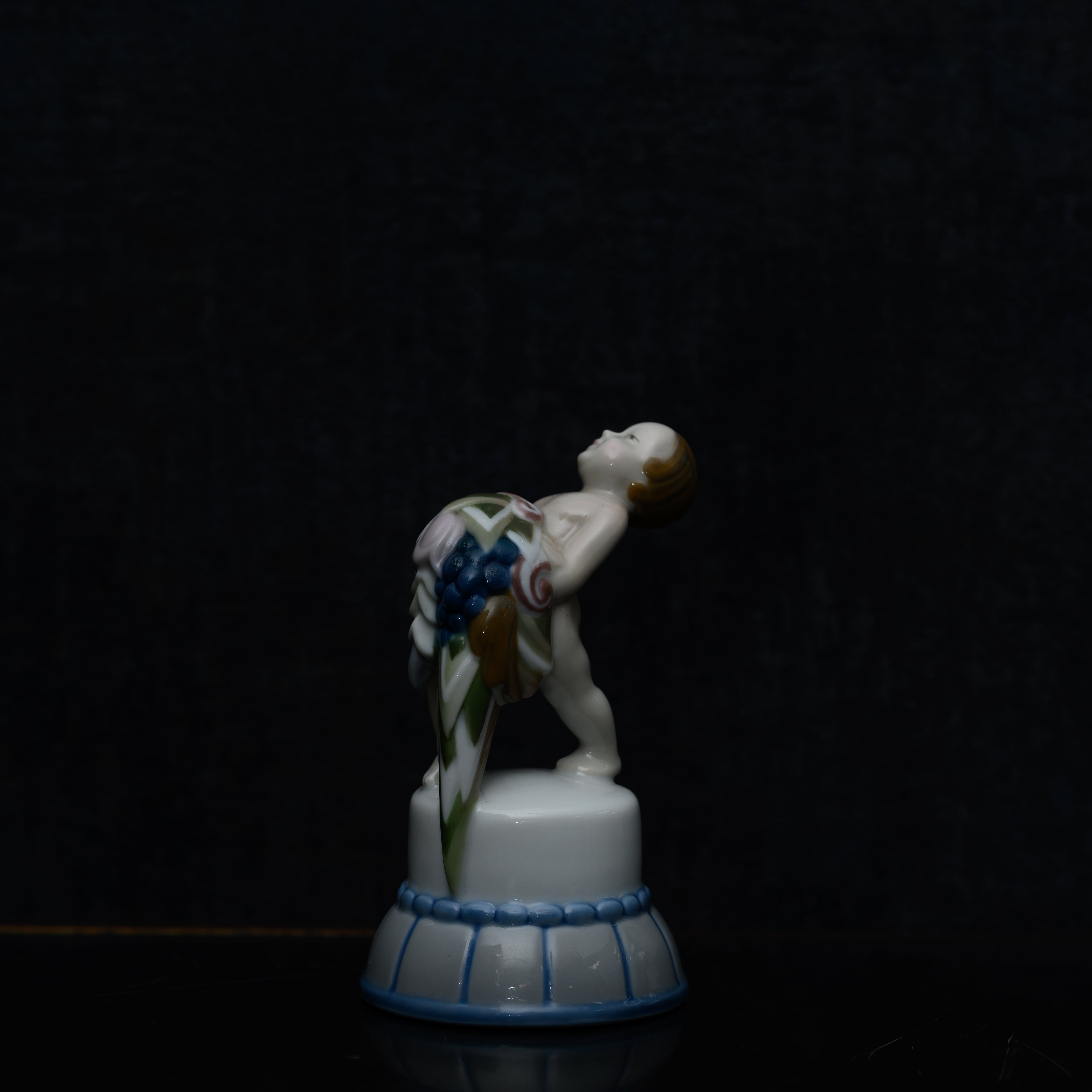 釉下彩のこの時代らしい色合い、そしてアールデコの幾何学的な表現、そしてなにより花束を重そうに持つプットーの姿と、その表情。