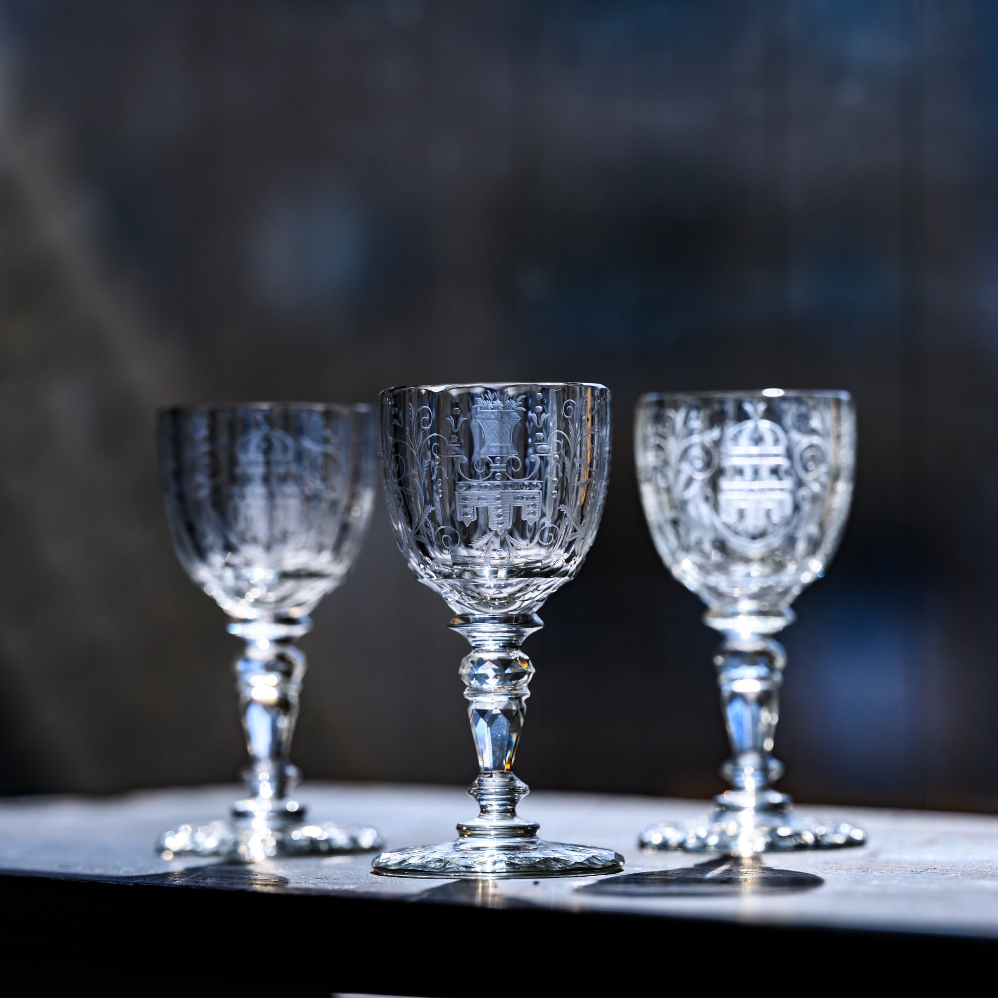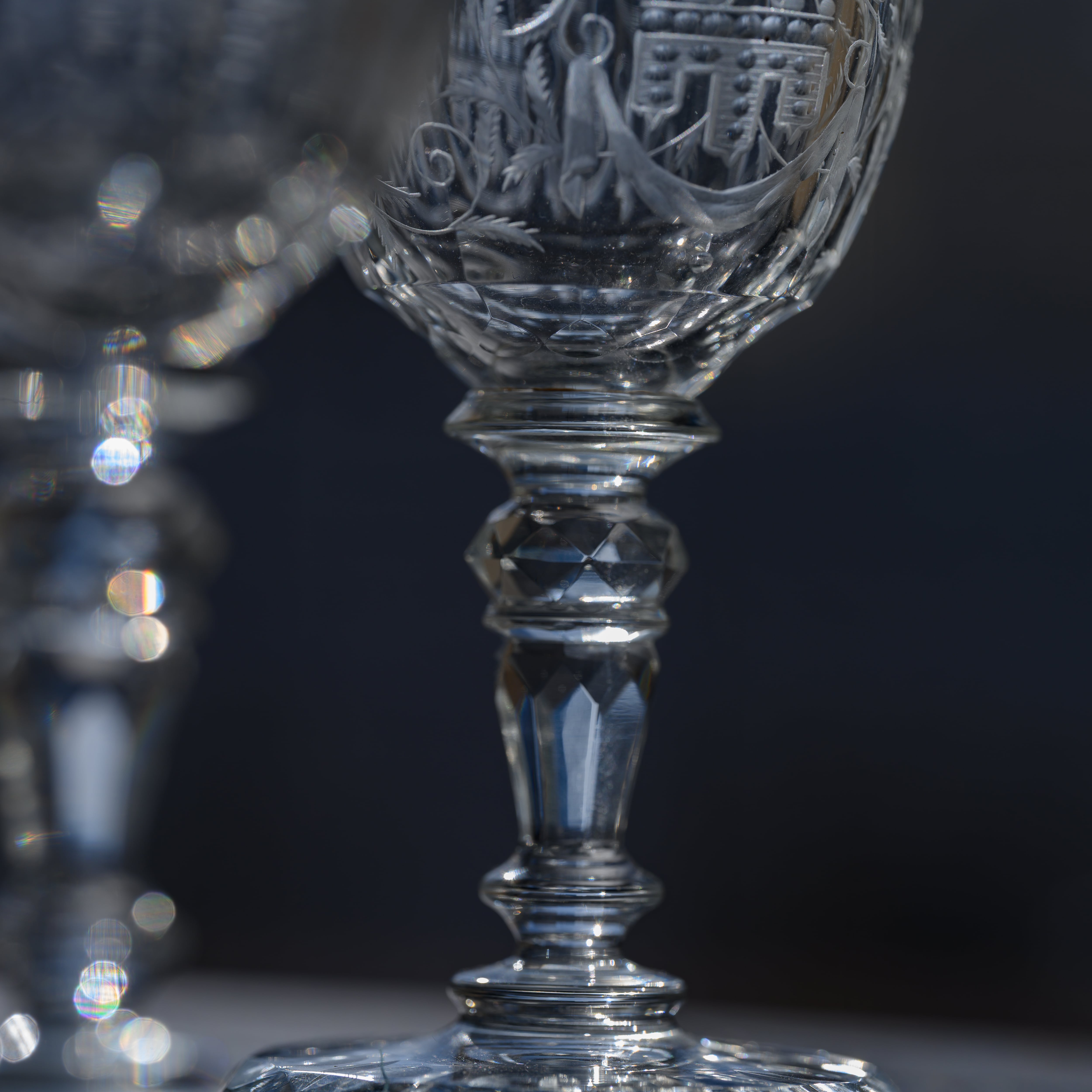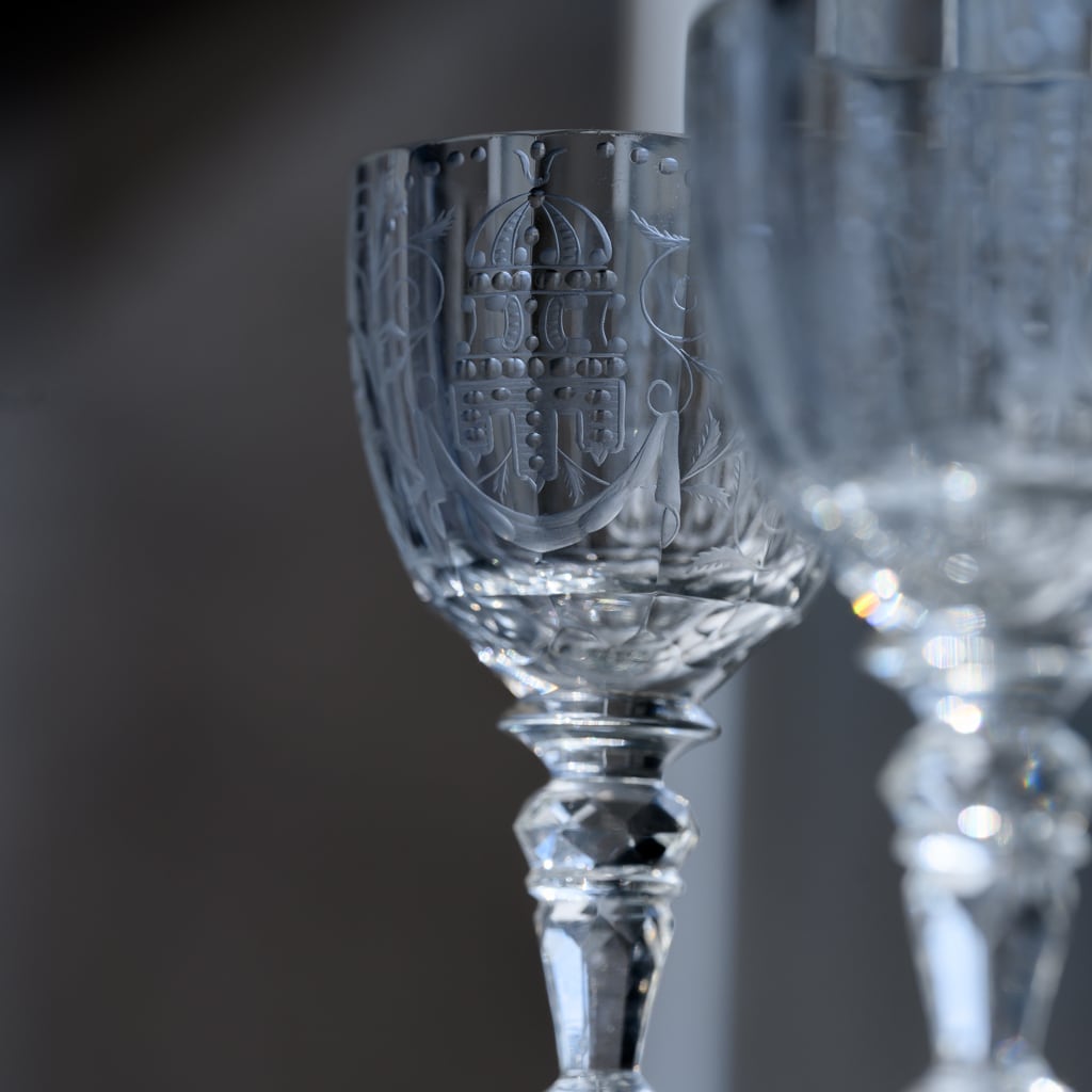 1910年にシュテファン・ラートによってデザインされた、ドリンキングセットNo.206「Maria Theresia」(マリア・テレジア)のグラスです。その名の通り18世紀半ばのマリア・テレジアの時代に流行したシレジアやボヘミアのガラスを再現したモデルです。複雑で美しいキレのあるカット装飾に、繊細なバロック様式のエングレーヴィング技術を施したグラスです。カットとエングレーヴィング装飾の相乗効果で非常に美しく見えるのが特徴です。